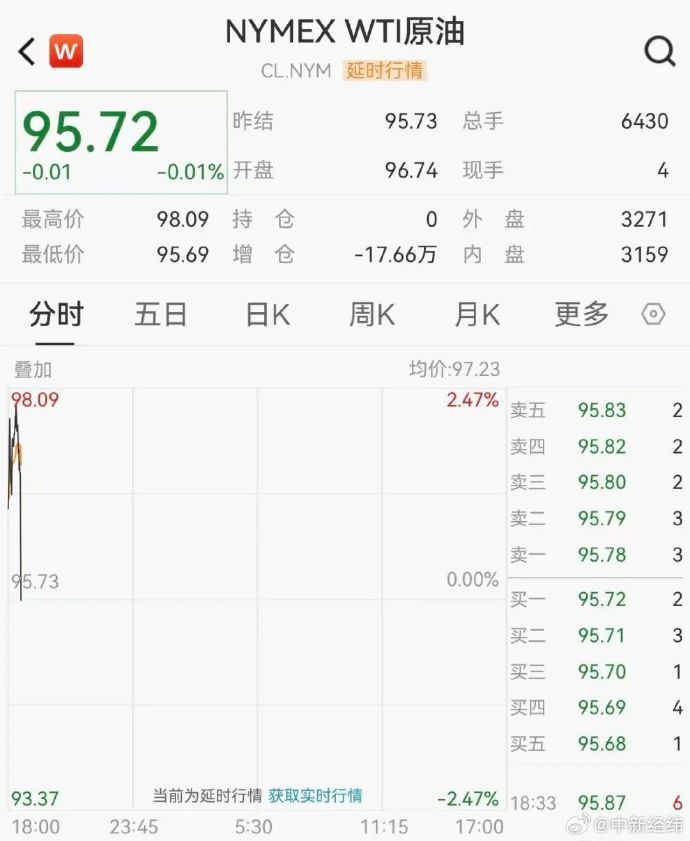 周四(3月12日),美国三大股指全线收跌,道指跌1.56%,标普500指数跌1.52%,纳指跌1.78%。大型科技股集体下跌,其中,特斯拉跌超3%,脸书跌逾2%,苹果跌近2%,谷歌、英伟达、亚马逊跌超1%。国际原油高开,WTI原油一度突破98美元/桶,随后短线跳水,跌破96美元/盎司。