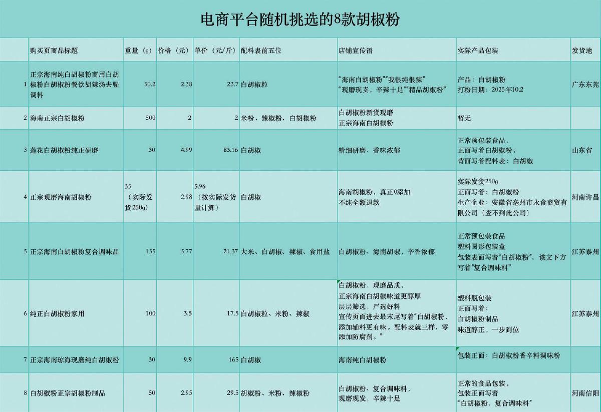 记者随机在电商平台上购买了8款胡椒粉产品,发现有4款产品打着“纯正”“正宗”的旗号,实际却是加了“大米”“米粉”等复合原料的调味料。