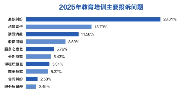 2025年教育培训相关投诉总量达81199件,累计涉诉金额达4.84亿元。从投诉问题结构看,投诉高度集中在消费履约与服务质量层面:退款纠纷以28.01%的占比位居首位,成为最突出的行业痛点;其次为虚假宣传(13.79%)、诱导消费(11.58%),三大问题合计占比超五成;此外,收费问题(8.59%)、服务态度差(5.76%)、分期贷款(5.43%)等问题也较为突出,整体凸显出教育培训行业在退费保障、宣传合规、服务履约等方面的规范短板。
