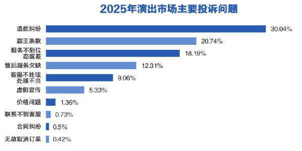 2025年演出市场相关投诉总量达38632件,累计涉诉金额达4471万元。从投诉问题结构看,投诉高度集中在履约与服务体验层面:退款纠纷以30.04%的占比位居首位,成为最突出的行业痛点;其次为霸王条款(20.74%)、服务不到位/态度差(18.19%),三大问题合计占比近七成。此外,售后服务欠缺(12.31%)、客服不处理/处理不当(9.06%)、虚假宣传(5.33%)等问题也较为突出,整体凸显出演出市场在退票退款、合同公平性、服务质量等方面的规范短板。