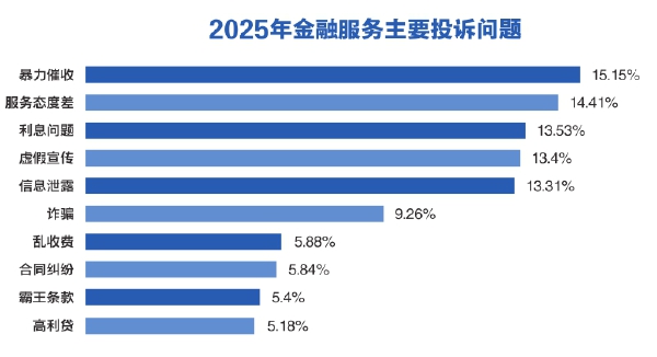 2025年金融服务相关投诉总量达390979件,累计涉诉金额达49.67亿元。从投诉问题结构看,暴力催收以15.15%的占比位居首位,服务态度差(14.41%)、利息问题(13.53%)、虚假宣传(13.4%)、信息泄露(13.31%)紧随其后,五大核心问题合计占比近七成,成为消费者投诉的主要痛点,反映出金融服务领域在合规经营、服务质量与消费者权益保护方面仍存在明显短板。