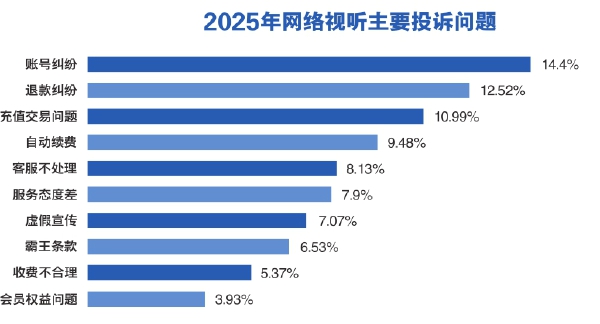【网络视听】账号纠纷、退款纠纷、充值交易投诉占比近四成