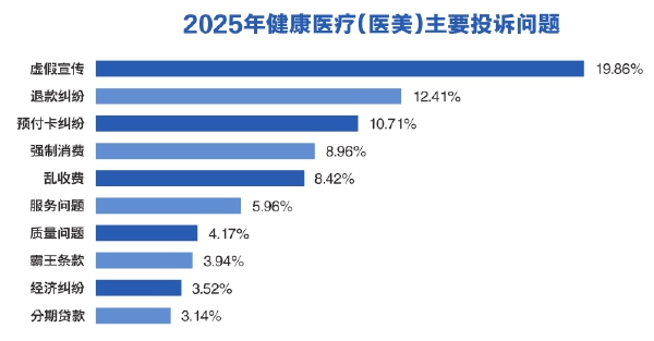 2025年健康医疗(医美)相关投诉总量达10082件,累计涉诉金额达1.39亿元。从投诉问题结构看,投诉集中在宣传合规、消费履约与服务管理层面:虚假宣传以19.86%的占比位居首位,成为最突出的行业痛点;其次为退款纠纷(12.41%)、预付卡纠纷(10.71%),三大问题合计占比超四成。此外,强制消费(8.96%)、乱收费(8.42%)、服务问题(5.96%)等问题也较为突出,整体凸显出医美行业在宣传合规、退款保障、预付卡管理、消费诱导等方面的规范短板。