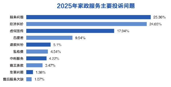 2025年家政服务相关投诉总量达7061件,累计涉诉金额超1300万元。从投诉问题结构看,投诉高度集中于服务质量与履约环节:服务问题(25.36%)、经济纠纷(24.65%)位列前两位,并列成为最突出的行业痛点;虚假宣传以17.94%的占比紧随其后,上述三大问题合计占比近七成。此外,态度差(9.54%)、退款纠纷(5.1%)、乱收费(4.54%)等问题也较为突出,凸显出家政服务行业在服务质量把控、经济履约管理、宣传行为合规等方面存在明显的规范短板。