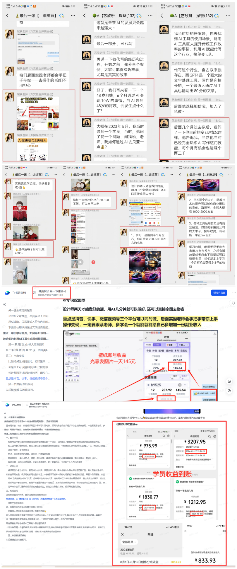 在微信群里,李明看到一些自称“AI实操金牌班主任”的“老师”大量群发各种科技圈大佬谈AI的剪切视频,宣传“AI是目前最大的风口,也是发展趋势”“你距离赚钱只差学会AI工具”等内容;在父亲购买的课件中,李明也注意到一个标题为“第二节课福利 韩赢院长”的云文档,其向学员介绍的内容出现了“像社会热点、猎奇、感人故事,婆媳矛盾等方面的内容很容易爆”等字样,并向学员展示疑似制作换头人体艺术照片等,同时他们还以课件福利的形式传授学员“日入1000+收入规则”等技巧。