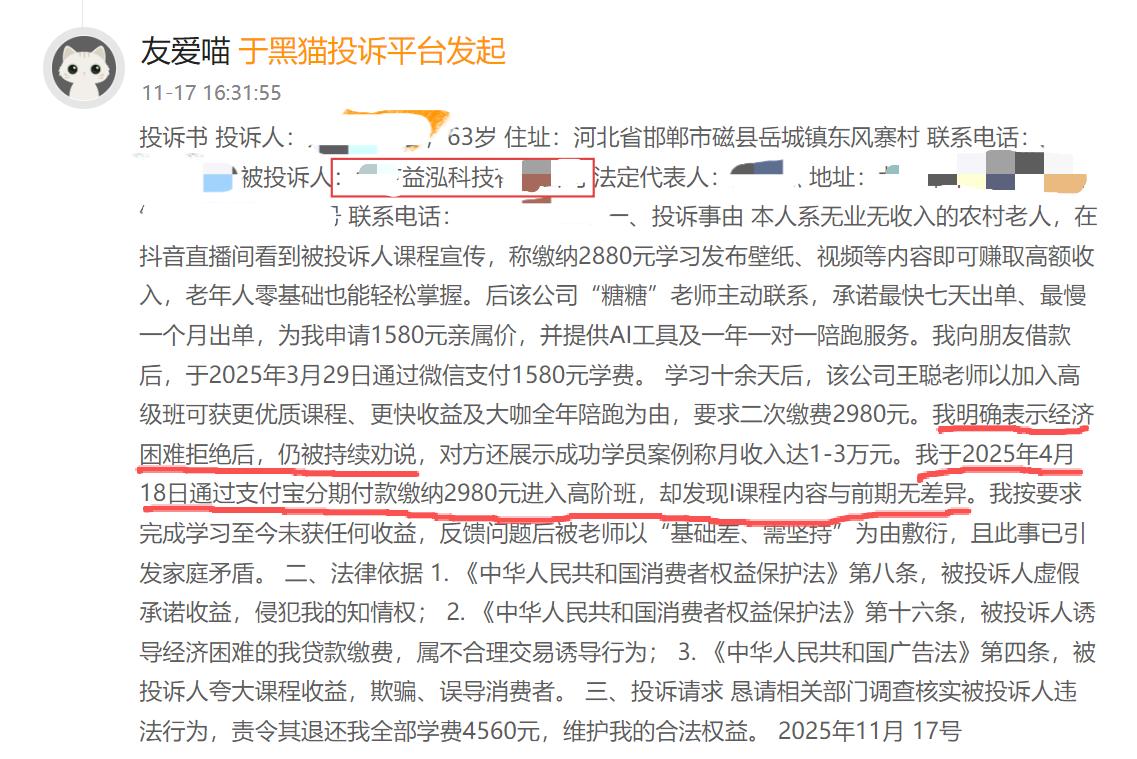 投诉平台显示,有老年投诉人称,自己无业无收入,在直播间看到益泓科技宣传“发壁纸、视频等内容即可赚取高额收入”“老年人零基础也能轻松掌握”的内容后,向朋友借款支付1580元学费,随后对方提出缴费2980元可加入高阶班,该位老人明确拒绝,表示经济困难,但对方仍持续“劝说”。最终老人于2025年4月18日通过网贷分期付款的方式缴纳2980元,进入益泓科技宣称的“高阶班”,但发现课程内容与前期无差异。