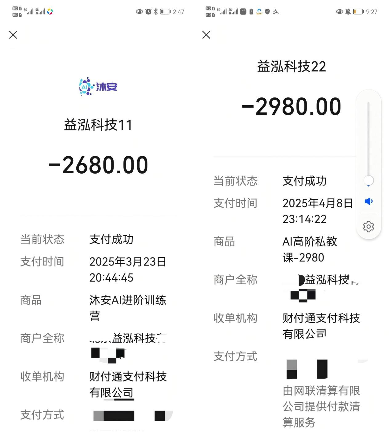 2025年3月23日、4月8日,李明父亲向益泓科技支付合计5660元AI相关课程学费的支付凭证。受访者供图