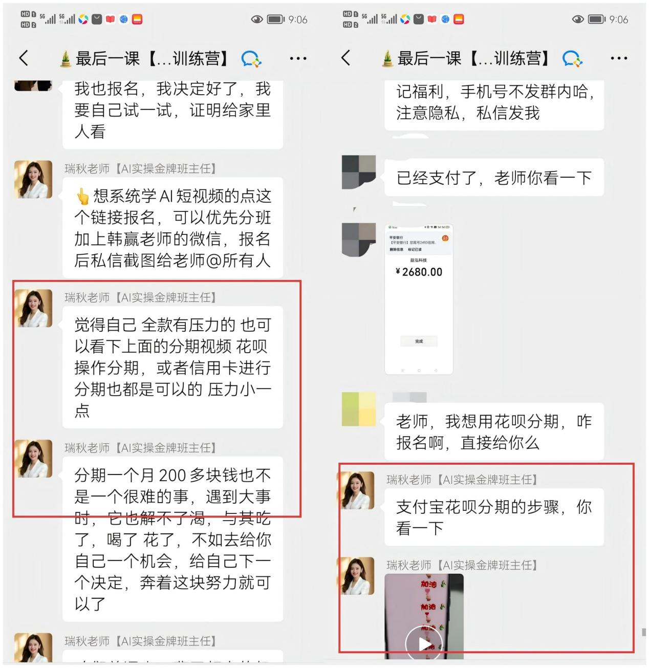 当一些学员表示类似“全款有压力”时,群里培训“老师”会明确告诉他们可以使用信用卡分期或开通花呗分期来支付,“老师”在群里不止一次介绍过开通花呗分期具体操作步骤的视频,同时也表示“分期一个月200多块钱也不是一件很难的事”。