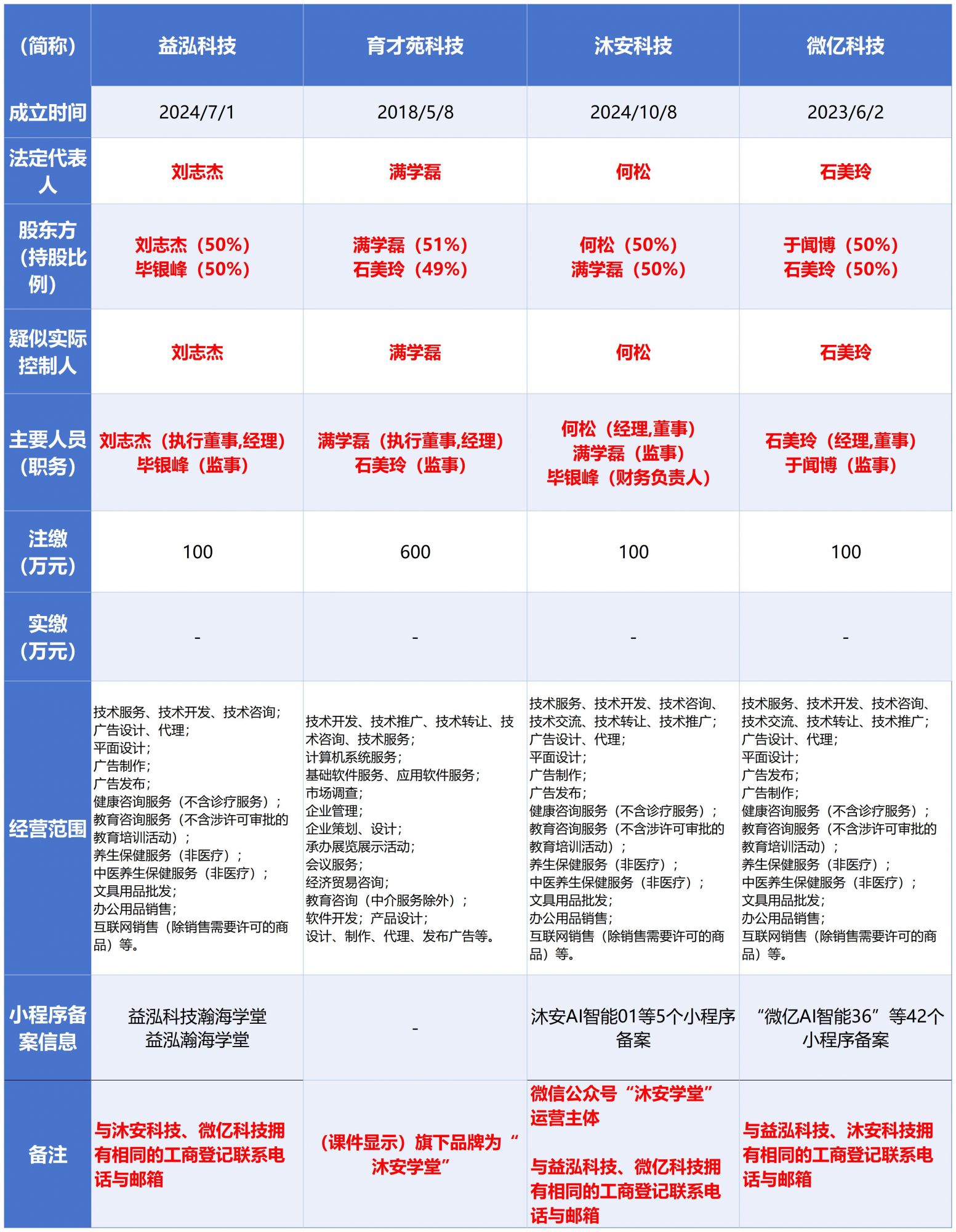“给学员看时,发的营业执照是育才苑科技,但收我父亲款的却是益泓科技。为什么会不一样?益泓科技、育才苑科技、沐安学堂、微亿智能科技(群里‘老师’企业微信备注单位名)这几个主体到底是什么关系?”李明不禁问道。