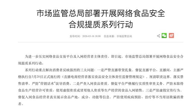 近日,国家市场监督管理总局(即“市场监管总局”)在官网发文称,为进一步压实网络食品交易平台及入网经营者主体责任,从3月16日起,市场监管总局部署开展网络食品安全合规提质系列行动。