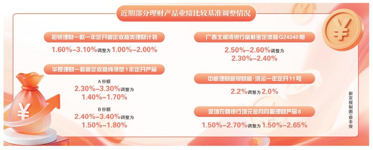 近期,多家银行理财公司发布的多只银行理财产品均调降了部分银行理财产品的业绩比较基准。