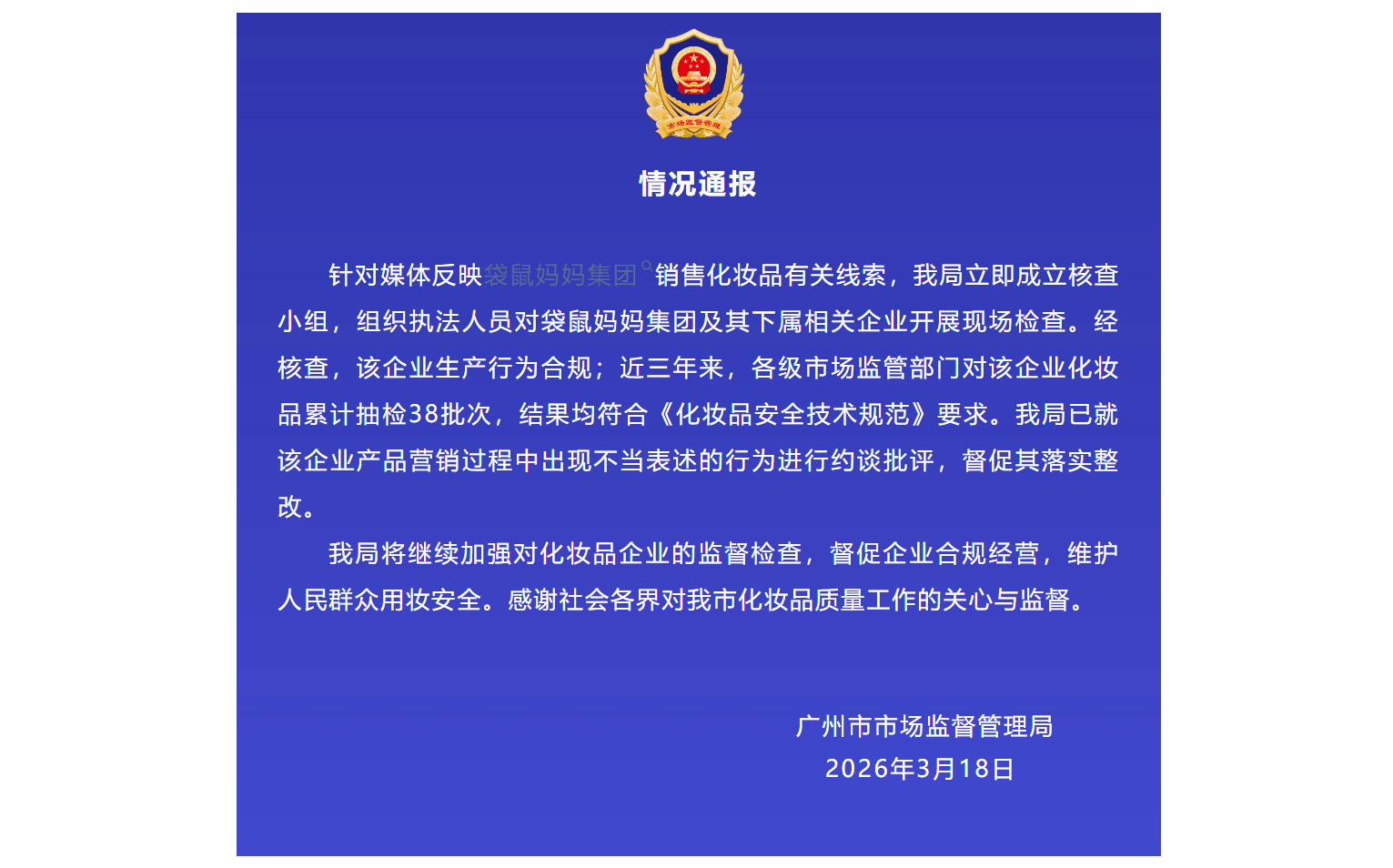 3月18日,“广州市场监管”微信公众号发布情况通报。针对媒体反映袋鼠妈妈集团销售化妆品有关线索,广州市市场监督管理局立即成立核查小组,组织执法人员对袋鼠妈妈集团及其下属相关企业开展现场检查。