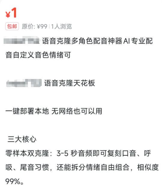 某电商平台售卖语音克隆软件,收费仅1元。 电商平台截图