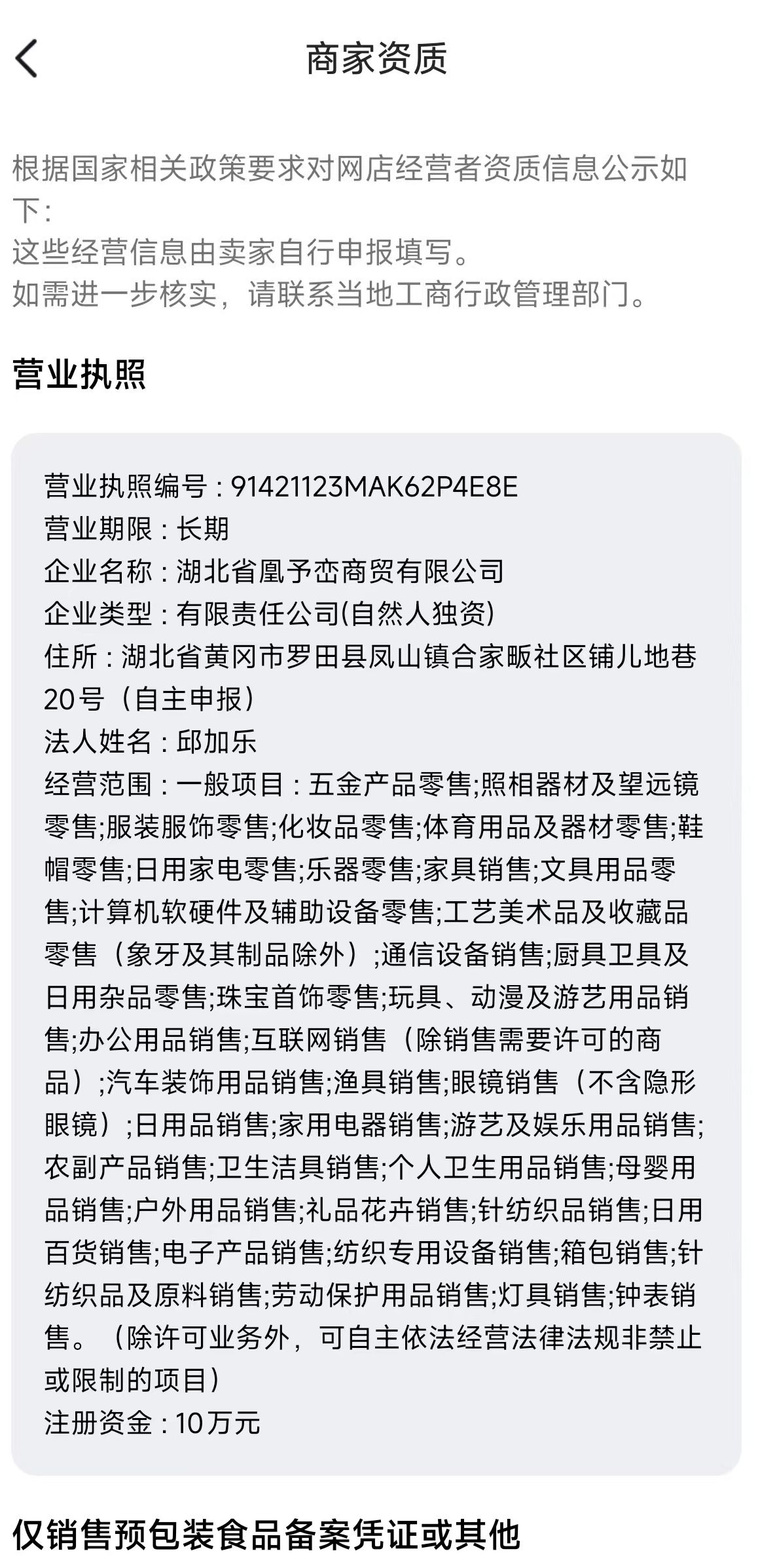 记者注意到,上述凰予峦商贸上传至平台的商家资质中,湖北省凰予峦商贸有限公司营业执照经营范围未包含食品销售或预包装食品销售以及酒类经营等内容,国家企业信用信息公示系统查询该公司营业执照,也未显示该内容。但该公司同时上传至平台的还有一张食品经营备案(仅销售预包装食品)信息采集表,并加盖罗田县市场监督管理局公章。这是否意味着该公司可以销售酒类?