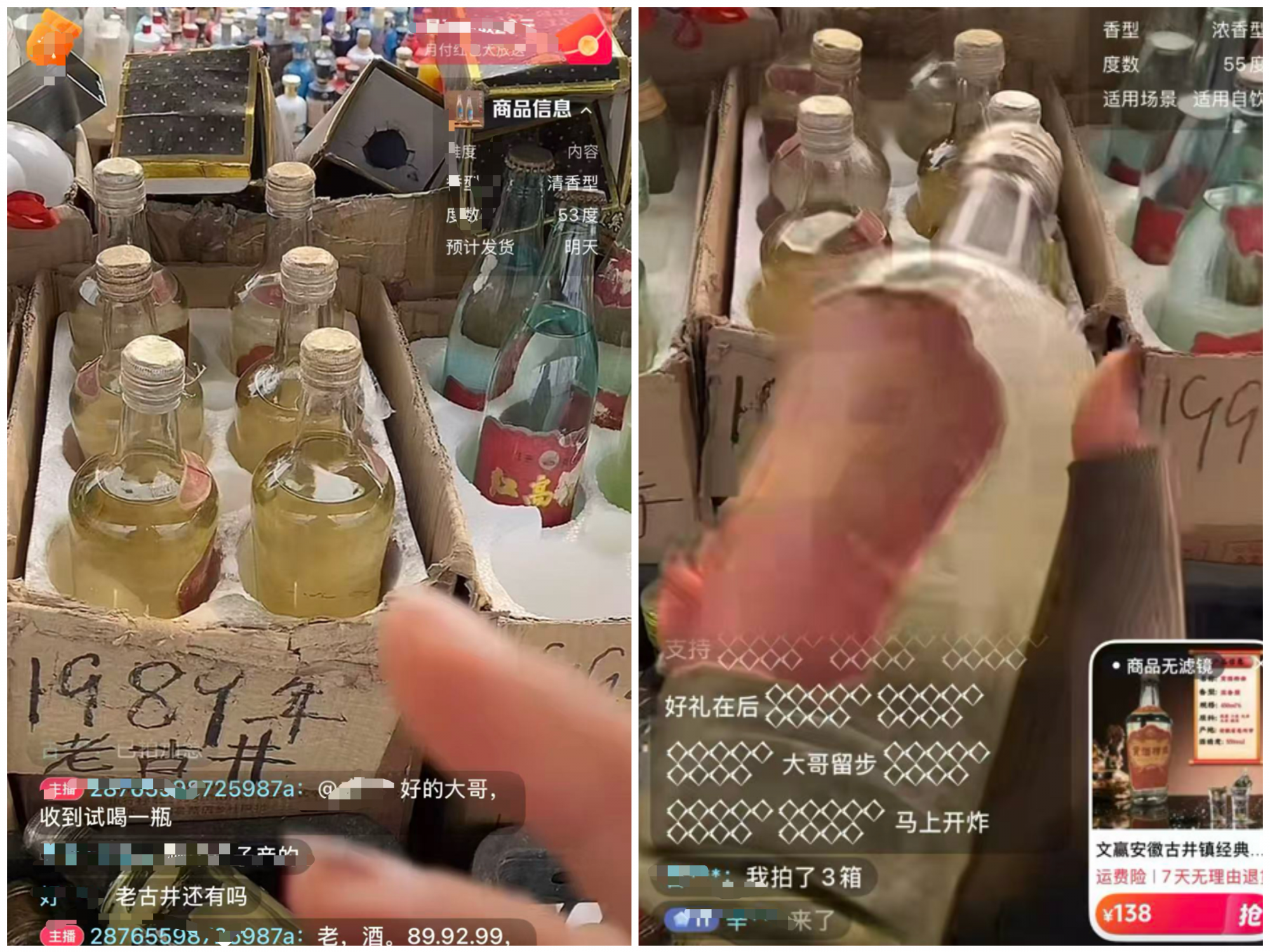 在上述直播间中,随着气氛升温,主播随即开始带货一款自称“1989年的老古井”,称其“原箱原厂,保真保老保年份”,并以138元一箱(6瓶)的价格出售,合每瓶约23元。