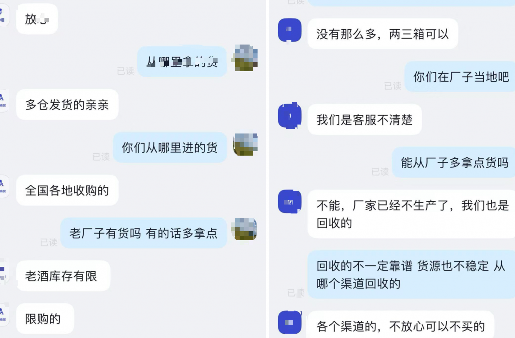 多个售卖老酒的客服称其产品系多个渠道回收。平台截图