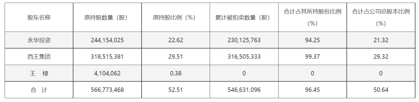 截至2026年3月13日,西王集团及其一致行动人所持西王食品股份累计被拍卖(含本次被拍卖股份)情况。