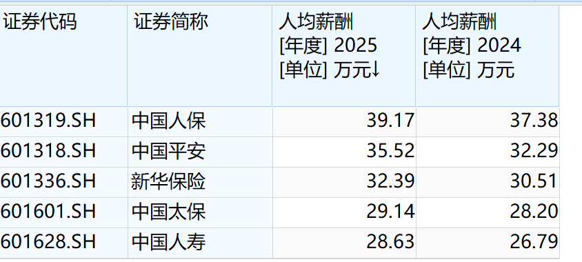 尽管员工数量下降,2025年五家上市险企的人均薪酬却集体提升。其中,中国人保的人均薪酬最高,达39.17万元,同比增长1.79万元;作为市场化险企的中国平安人均薪酬排名第二,达35.52万元,人均涨薪3.23万元。新华保险、中国太保、中国人寿的人均薪酬则为32.39万元、29.14万元及28.63万元,人均分别涨薪1.88万元、0.94万元和1.84万元。