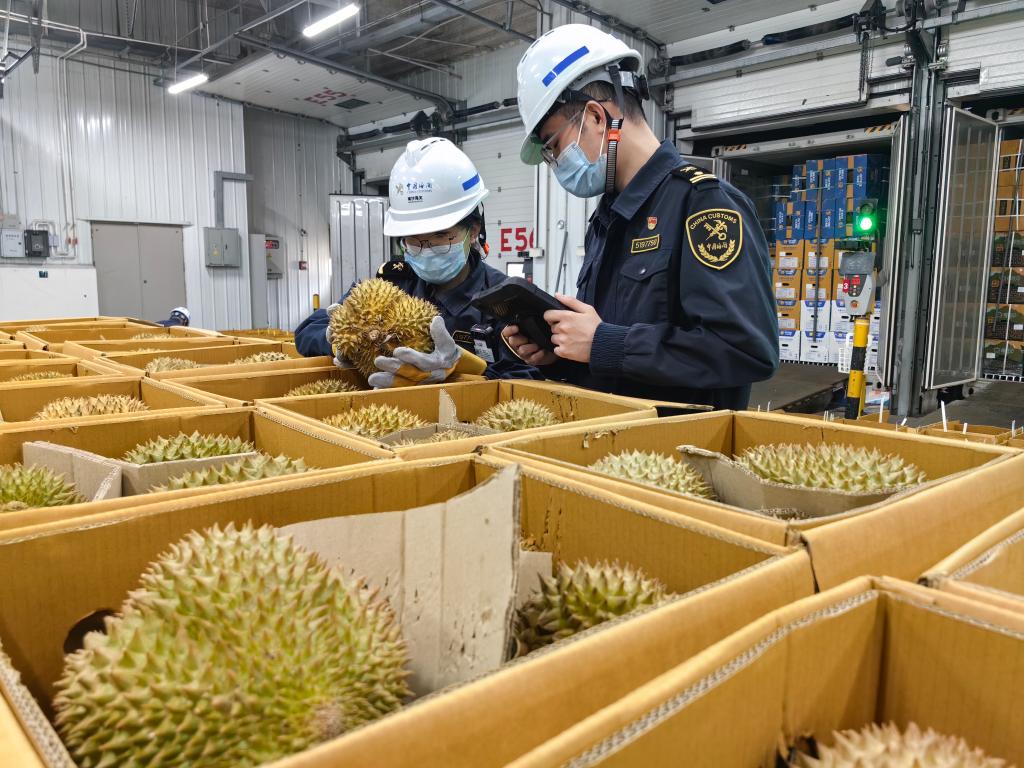 4月26日,南沙海关关员对进口鲜食榴莲进行监管查验。新华社发